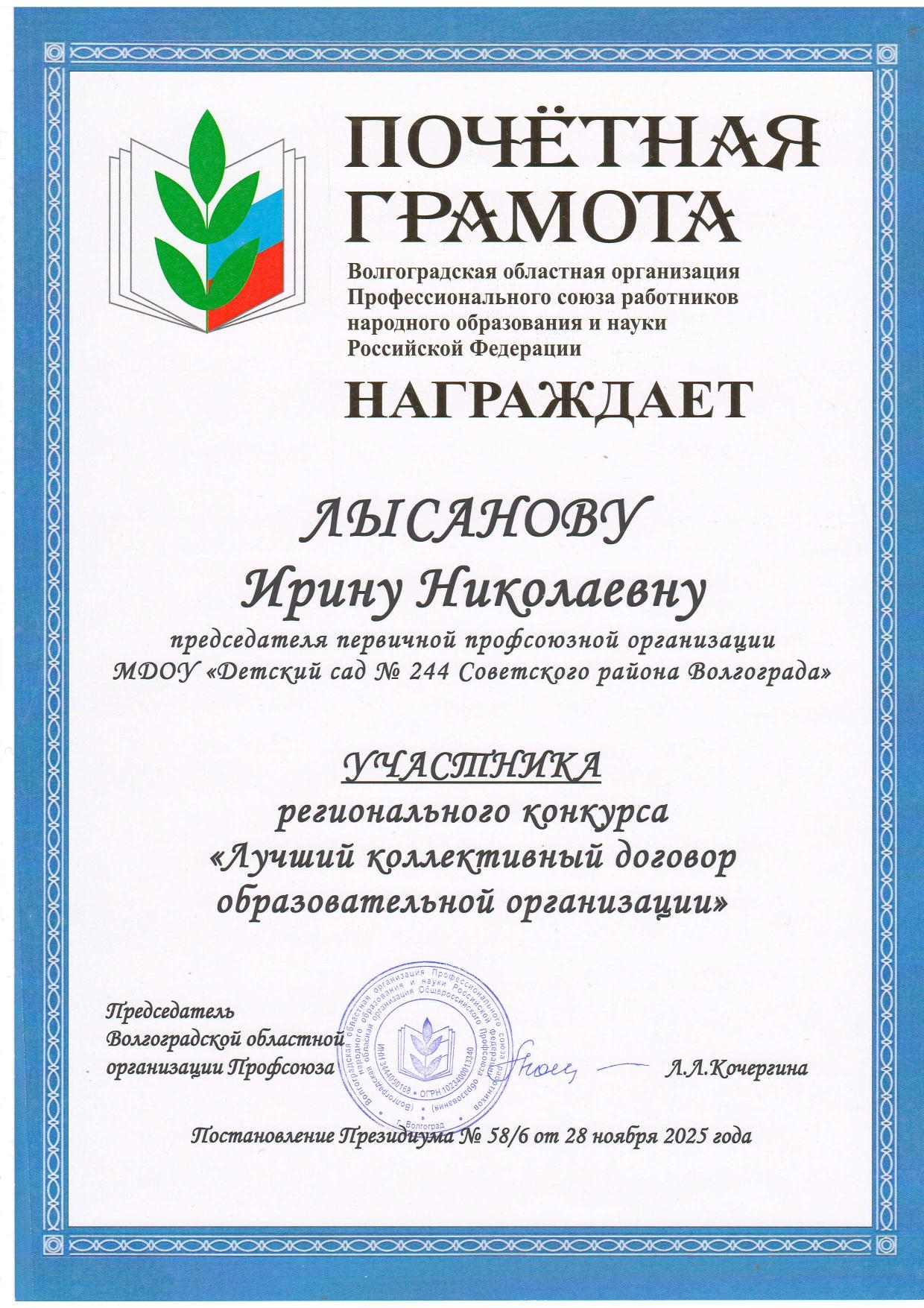 Председатель Территориальной (районной) организации профсоюза работников народного образования и науки РФ Советского района г.Волгограда Лиманская Татьяна Николаевна